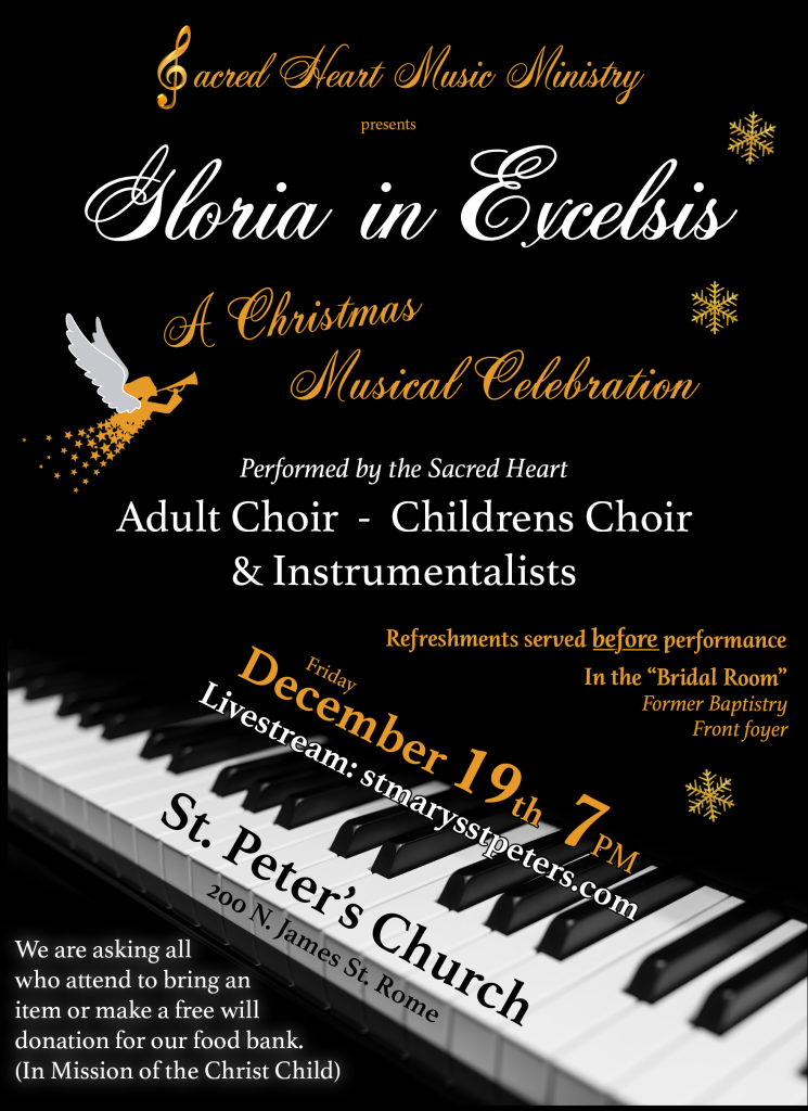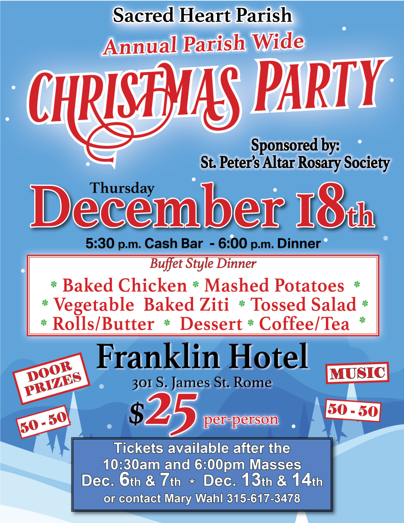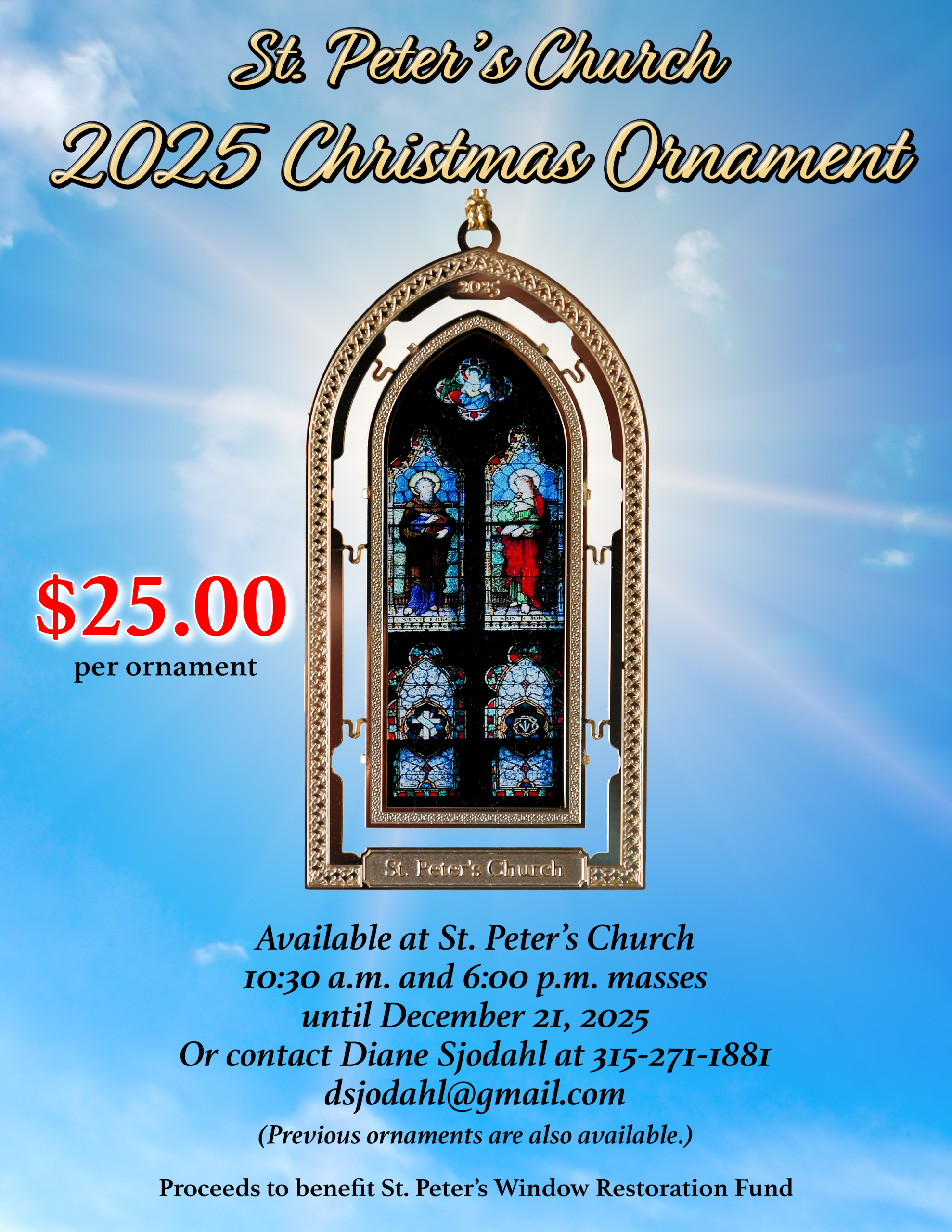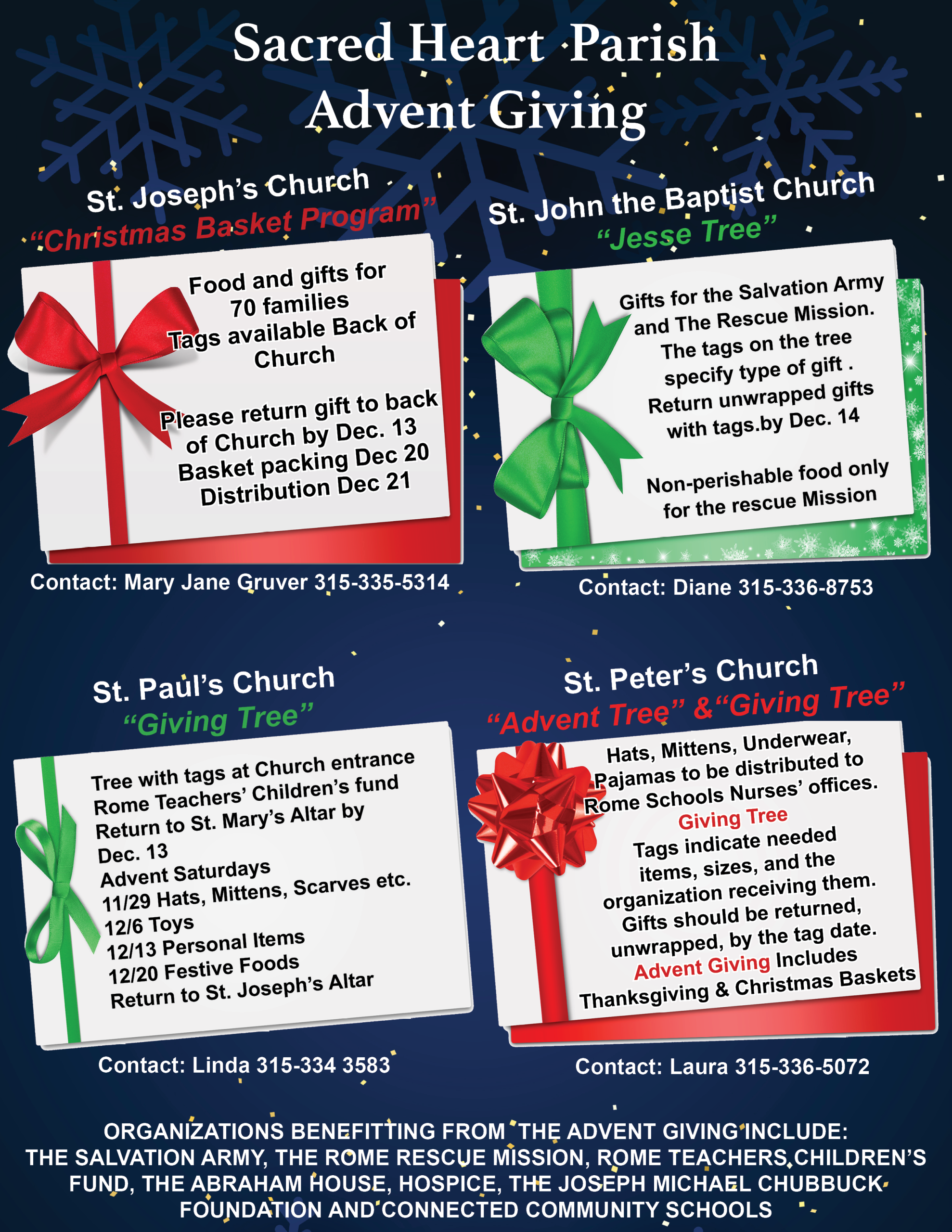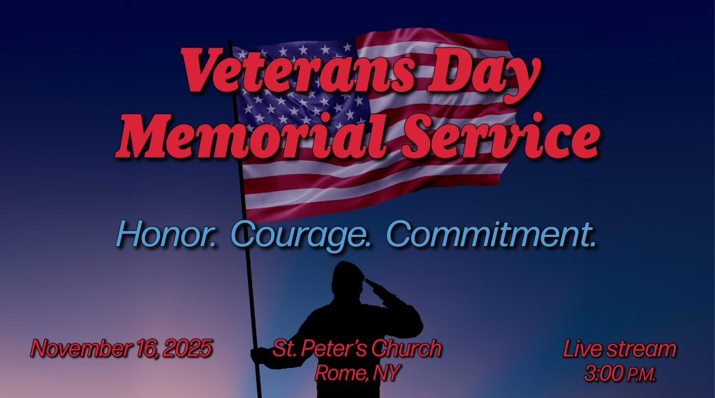 HOME Mass Schedule at St. Peter’sSunday:10:30 AM, 6:00 PMLive Stream: 10:30 AMWeekdays:Monday, Wednesday, Friday – 7:00 AMTuesday, Thursday – 8:00 AMPlease check our website(stmarysstpeters.com) and Facebook Page (Sacred Heart Parish, Rome NY) for additional information. Our live stream is available here. SUNDAY, NOVEMBER 30, 2025 LIVESTREAM MASS 2025 VETERANS DAY MEMORIAL SERVICE HOPE APPEAL 2025 Click on the "Prayer Corner" and take a moment to "Pray With Us".