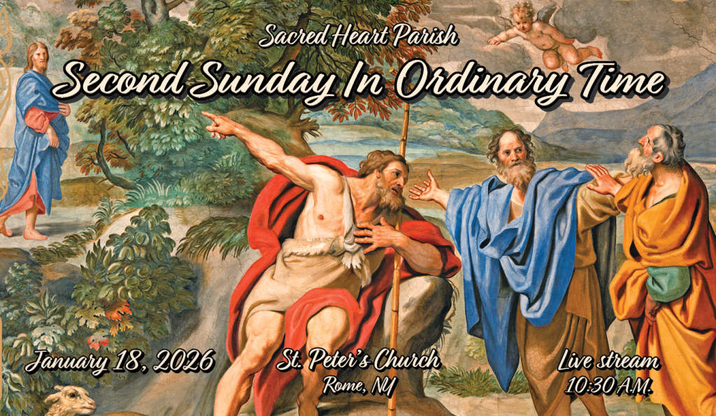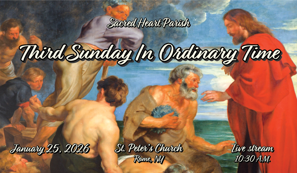 HOME Mass Schedule at St. Peter’sSunday:10:30 AM, 6:00 PMLive Stream: 10:30 AMWeekdays:Monday, Wednesday, Friday – 7:00 AMTuesday, Thursday – 8:00 AMPlease check our website(stmarysstpeters.com) and Facebook Page (Sacred Heart Parish, Rome NY) for additional information. Our live stream is available here. THIRD SUNDAY IN ORDINARY TIME LIVESTREAM MASS SECOND SUNDAY IN ORDINARY TIME LIVESTREAM MASS Request for Proposal (RFP) HOPE APPEAL 2025 Click on the "Prayer Corner" and take a moment to "Pray With Us".