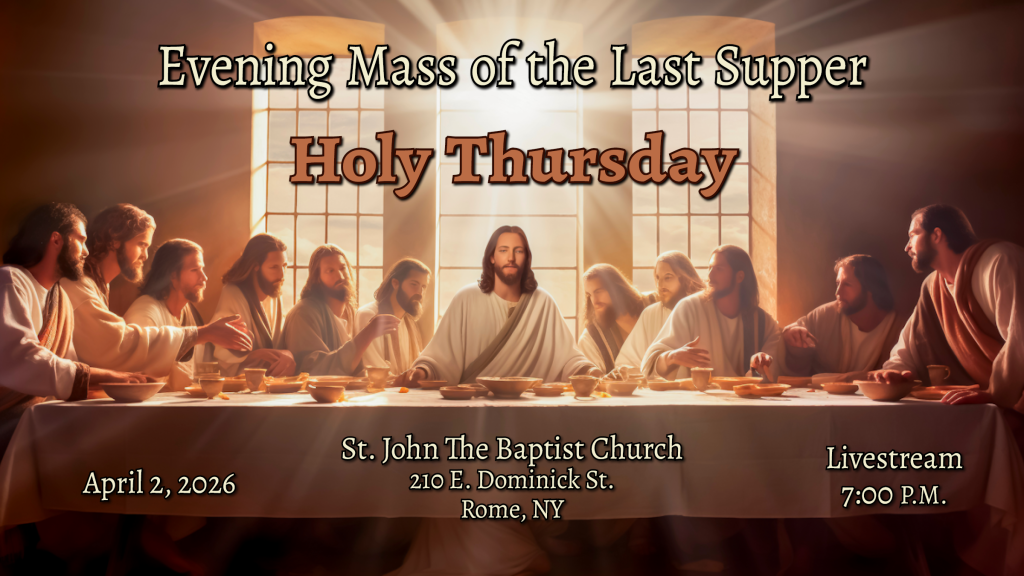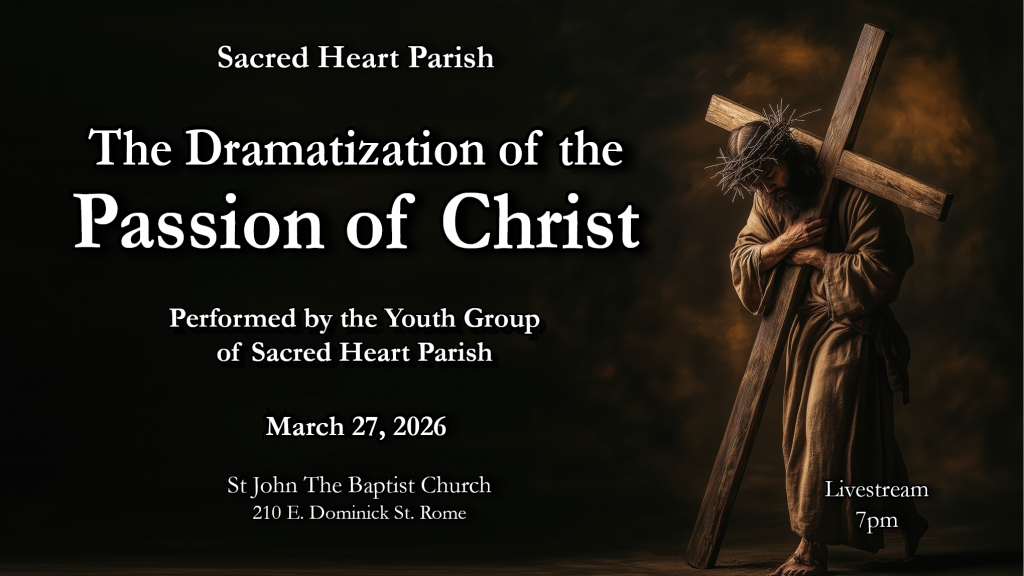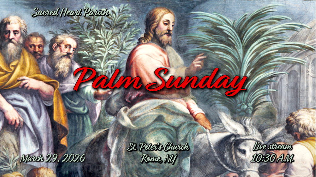 HOME Mass Schedule at St. Peter’sSunday:10:30 AM, 6:00 PMLive Stream: 10:30 AMWeekdays:Monday, Wednesday, Friday – 7:00 AMTuesday, Thursday – 8:00 AMPlease check our website(stmarysstpeters.com) and Facebook Page (Sacred Heart Parish, Rome NY) for additional information. Our live stream is available here. FIFTH SUNDAY OF LENT LIVESTREAM EXPLANATORY MASS LIVESTREAM PASSION OF CHRIST Click on the "Prayer Corner" and take a moment to "Pray With Us".