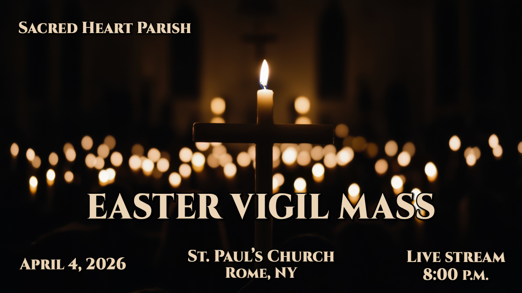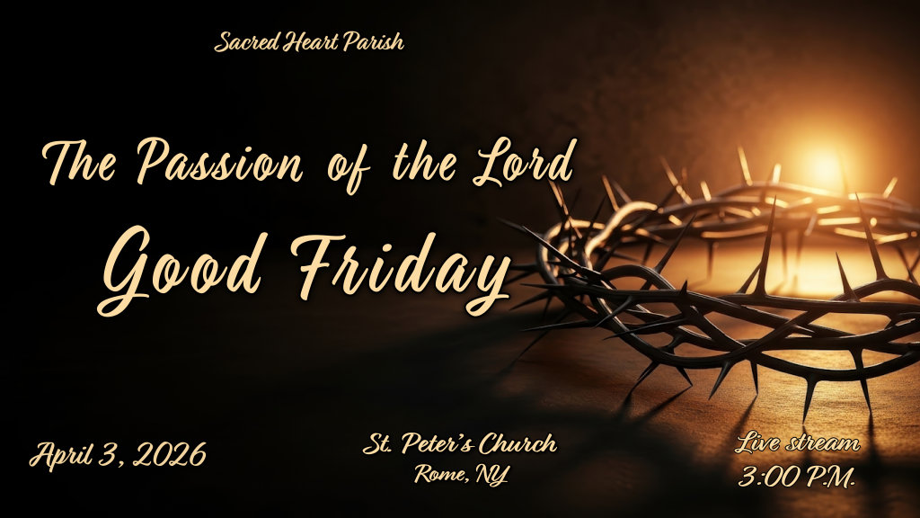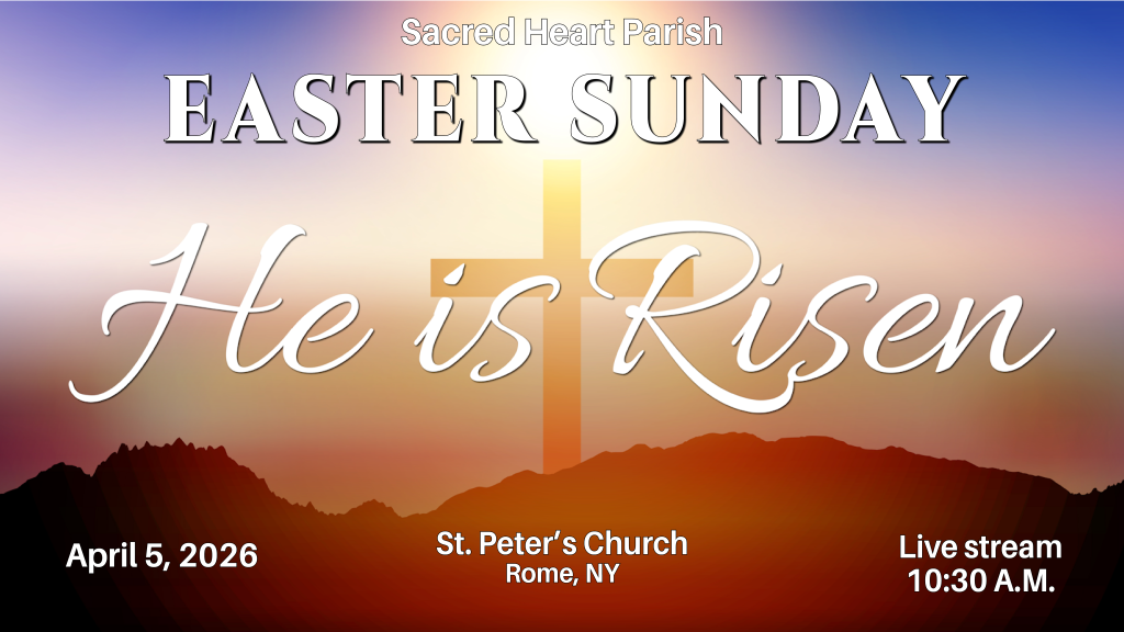 HOME Mass Schedule at St. Peter’sSunday:10:30 AM, 6:00 PMLive Stream: 10:30 AMWeekdays:Monday, Wednesday, Friday – 7:00 AMTuesday, Thursday – 8:00 AMPlease check our website(stmarysstpeters.com) and Facebook Page (Sacred Heart Parish, Rome NY) for additional information. Our live stream is available here. HOLY THURSDAY EVENING MASS LIVESTREAM GOOD FRIDAY LIVESTREAM EASTER VIGIL MASS LIVESTREAM EASTER MORNING MASS LIVESTREAM HOLY THURSDAY EVENING MASS LIVESTREAM FIFTH SUNDAY OF LENT LIVESTREAM PASSION OF CHRIST Click on the "Prayer Corner" and take a moment to "Pray With Us".